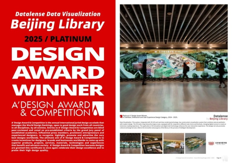 فاز "نظام تصور بيانات مكتبة بكين الحضرية" بالجائزة البلاتينية لجائزة التصميم لعامي 2024-2025. يُحوّل النظام المبنى والبيئة المحيطة إلى مساحة رقمية ثلاثية الأبعاد غامرة، تُعرض على شاشة تفاعلية بعرض 18 مترًا وارتفاع 3 أمتار في الطابق السفلي الأول من مكتبة بكين الحضرية، محققًا التكامل الثنائي بين "المساحة المادية والخدمات الرقمية".