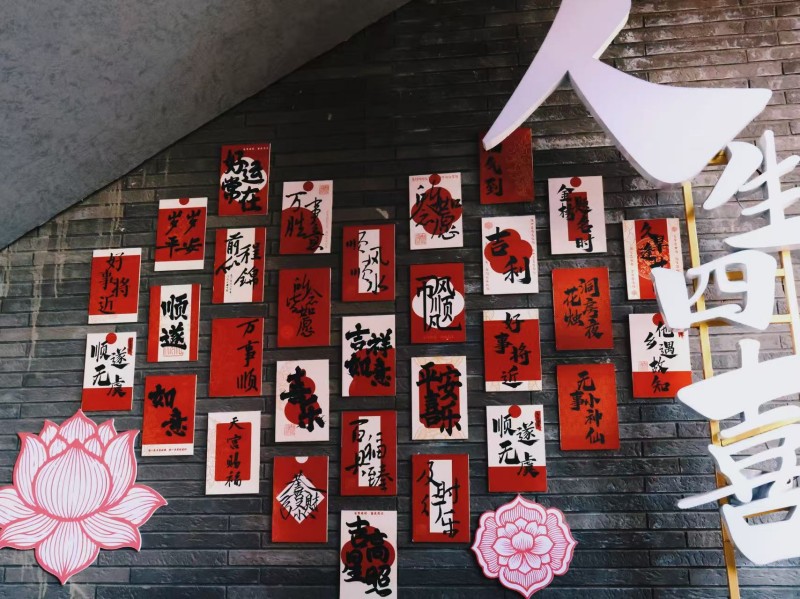 طفلٌ يستلقي أمام كلمة السعادة " فو (福)"