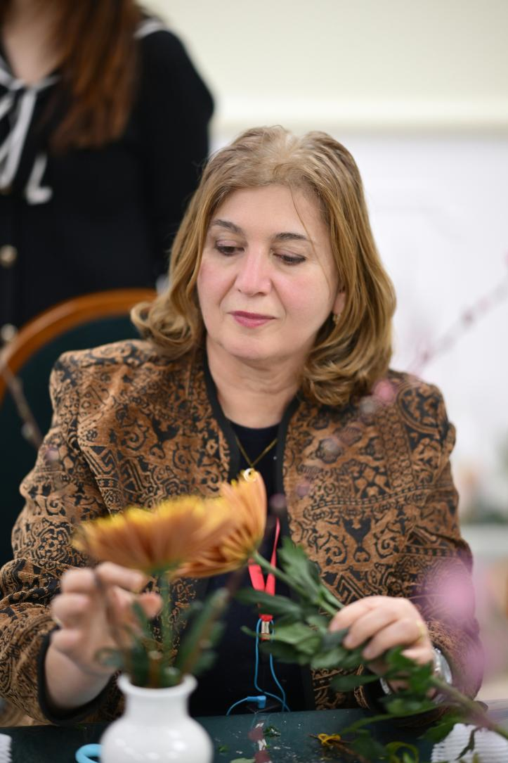 صورة مقدمة من جمعية بكين الشعبية للصداقة مع الدول الأجنبية: هيلدا بودا، زوجة السفير الألباني لدى الصين، خلال تجربة تنسيق الزهور