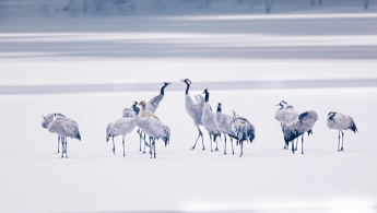 ظهور 16 طائرًا من فصيلة الكركي الرمادي، من الحيوانات المحمية الوطنية من الدرجة الثانية، على سطح الجليد في حي شون إي ببكين