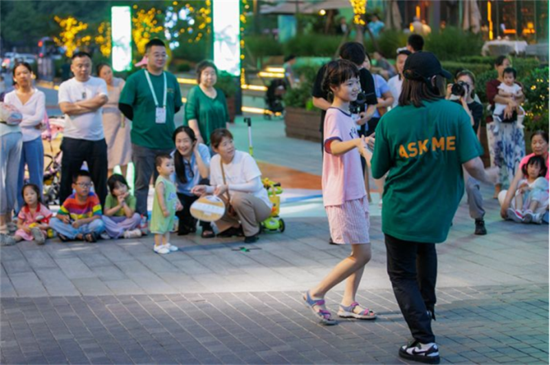 ترقص الموظفة رقصة الجاز مع الطفلة في شارع وانغ جينغ الصغير.