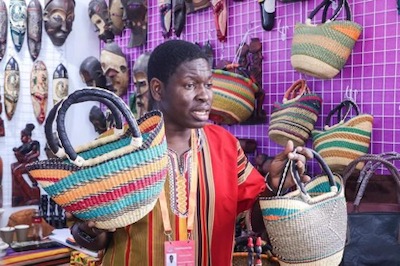 في جناح سفارة جمهورية أوغندا لدى الصين، قام الموظف بعرض المنتجات الحرفية الخاصة بهم