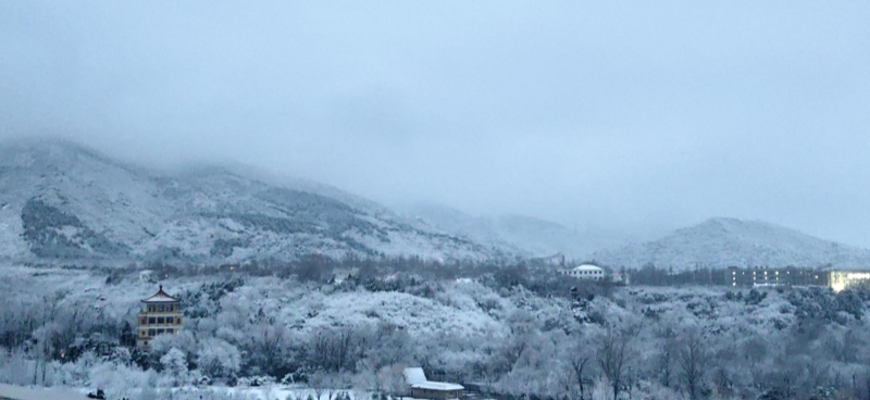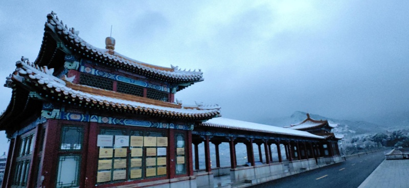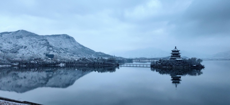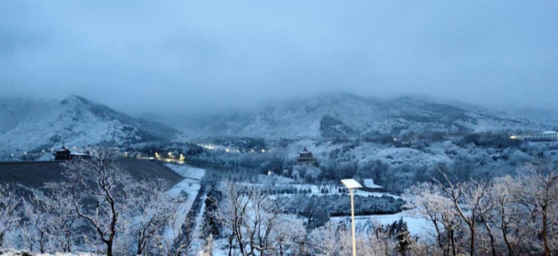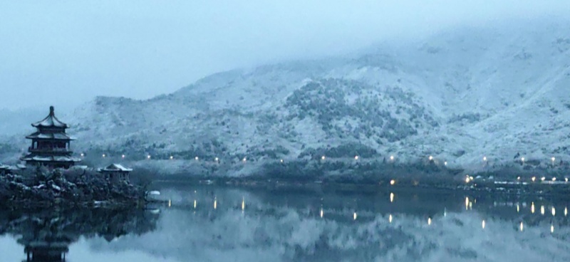 بعد عيد الربيع، تساقطت أولى الثلوج المبشِّرة برفق؛ تساقط الثلج على الجبال الخضراء، ومع انبلاج الفجر، كان خزان المقابر الثلاثة عشر في حي تشانغ بينغ ساكنًا وجميلًا، يرسم لوحةً من فن الحبر والماء.