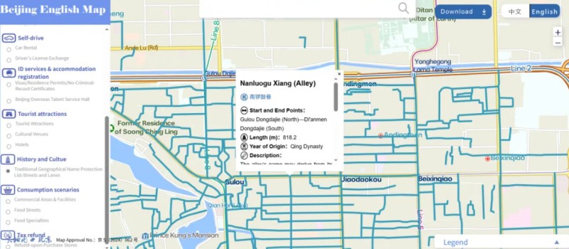كما أصبحت المعلومات الواردة في الخريطة الجديدة أكثر ثراءً، بما في ذلك إجراءات استرداد الضرائب عند المغادرة، وأرقام هواتف نقاط خدمات، واستبدال رخص القيادة وتأجير السيارات، ومعلومات تصنيف الفنادق، وأوقات افتتاح الحدائق والمعالم السياحية؛ كما أن الخصائص التاريخية والثقافية أصبحت أكثر وضوحًا، حيث تم تسليط الضوء على التراث الثقافي العالمي في بكين، والمعالم التاريخية والثقافية الرئيسية، والشوارع التقليدية والأزقة القديمة، والعلامات التجارية العريقة وغيرها من المعلومات الثقافية التاريخية.