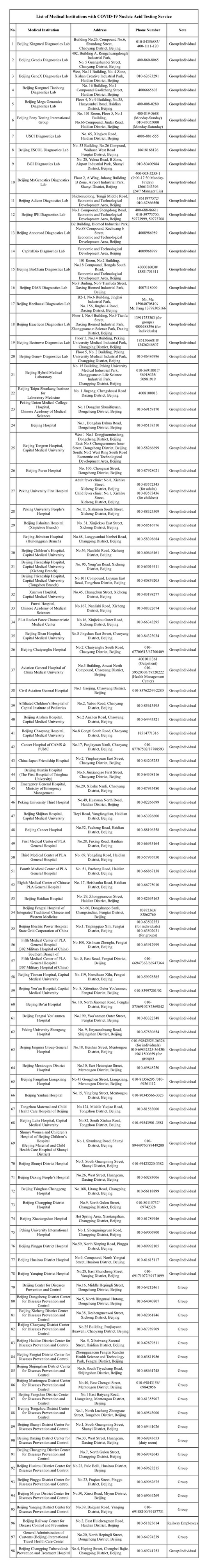 يوجد في بكين حاليًا 98 مؤسسة طبية تقدم خدمة اختبار الحمض النووي لـ COVID-19 للمجموعات والأفراد ، مع قدرة اختبار يومية قصوى لأكثر من 90.000 شخص. قائمة هذه المؤسسات الطبية مرفقة على النحو التالي. إذا كنت بحاجة إلى اختبار ، فيرجى تحديد موعد مسبقًا.