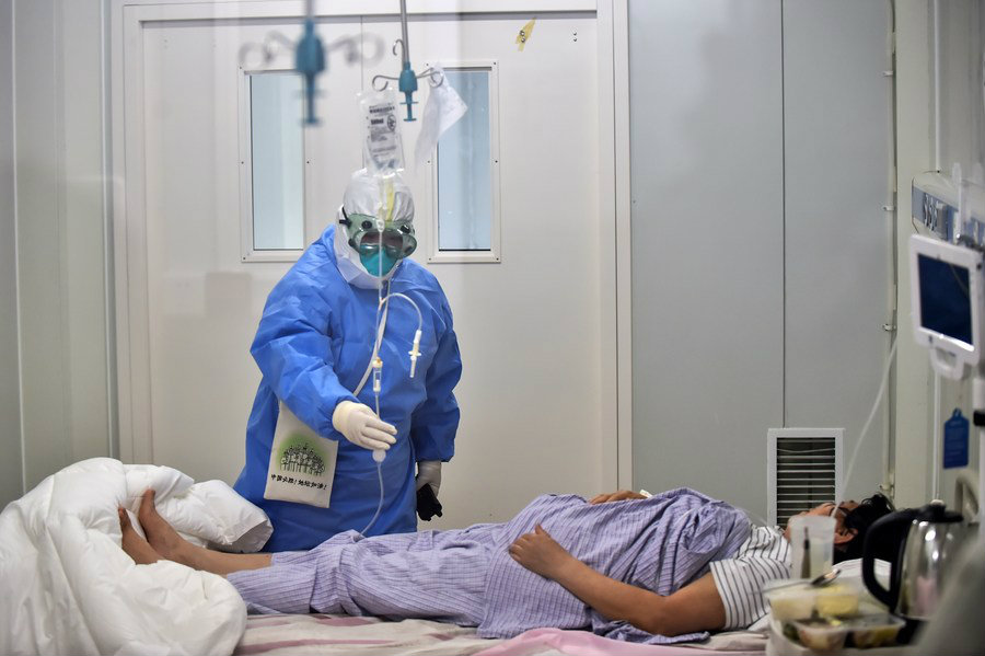 ممرضة تعالج مريضاً مصاباً بفيروس كوفيد -19 في جناح العزل في مستشفى بكين ديتان في بكين ، عاصمة الصين ، 16 يونيو 2020. [تصوير بنغ زيانج / شينخوا]