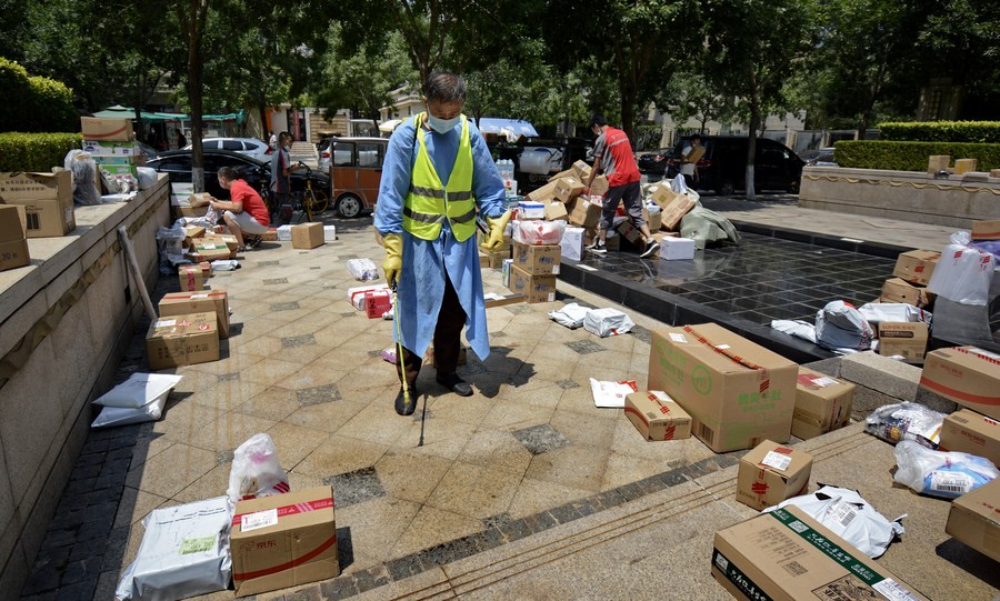 عامل مجتمعي يقوم بتطهير منطقة مخصصة لتوصيل الطرود في مجتمع سكني في مدينة جيوجونج ، منطقة داشينج ، بكين ، عاصمة الصين ، 21 يونيو 2020. [Photo Li Xin / Xinhua]