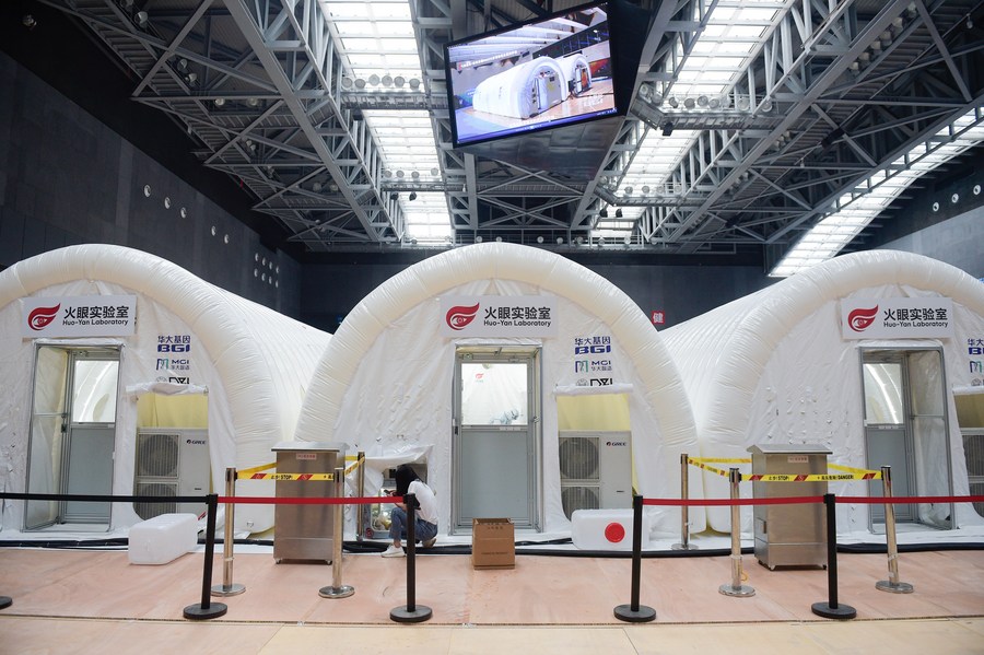 تُظهر الصورة التي تم التقاطها في 22 يونيو 2020 مختبر اختبار الحمض النووي لـ COVID-19 "Huoyan" أو Fire Eye بهياكل منفوخة بالهواء في منطقة داشينغ ، العاصمة الصينية بكين. [تصوير بنغ زيانج / شينخوا]