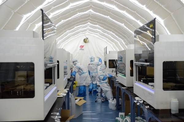 عمال يقومون بتجميع معمل محمول لاختبارات الحمض النووي في مركز رياضي في منطقة داشينغ ببكين يوم الاثنين. تم تصميم المختبر لمعالجة 10000 عينة في اليوم. [صورة من وكالة شينخوا]