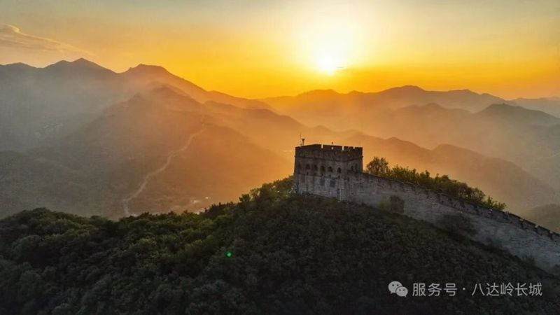 يتميز سور الصين العظيم - جزء با دا لينغ في المساء بلحظات رومانسية، حيث يملأ اللون البرتقالي لغروب الشمس المكان، متألقة مع صورة سور الصين العظيم المتعرجة.