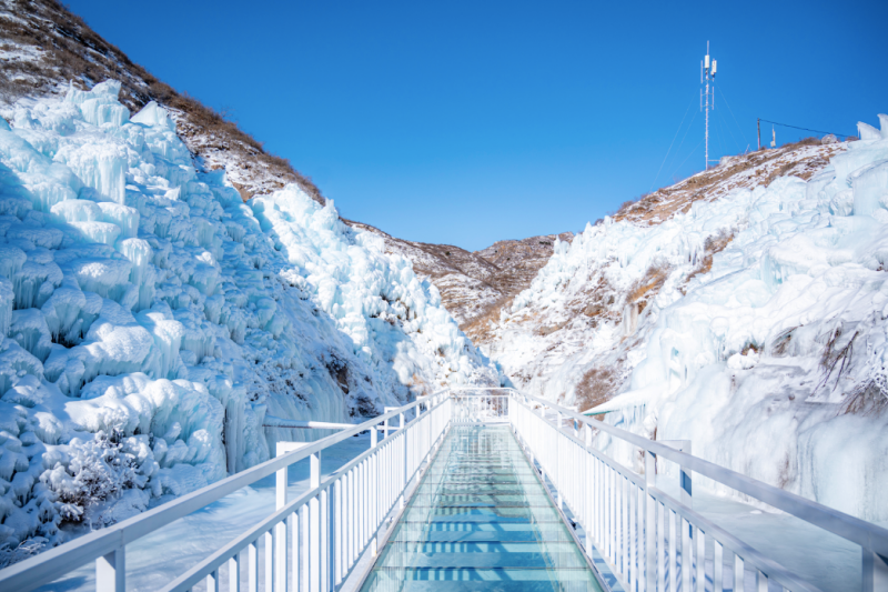 في وادي يون بو قو في فصل الشتاء، تتحول الجداول التي كانت تتدفق في الوادي إلى منظر طبيعي خلاب ومذهل للشلالات الجليدية.