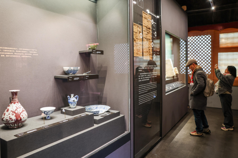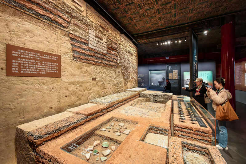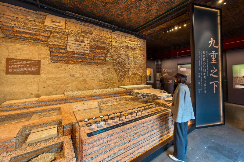وتتجسد أبرز النتائج الأثرية في جدار واحد داخل المعرض، حيث عُرض مقطع تشريحي مُعاد إنتاجه بنسبة 1:1 تحت رقم JP24. وتظهر على هذا الجدار طبقات متراكبة من آثار الحفر، تتقاطع فيها بقايا الأساسات والجدران العائدة إلى عهود أسر يوان ومينغ وتشينغ الملكية، وتظهر بين الطبقات شظايا متفرقة من مكونات معمارية، وقطع خزفية، وعظام حيوانات تعود إلى فترات تمتد من أسرة جين الملكية وصولا إلى أسرة تشينغ الملكية.