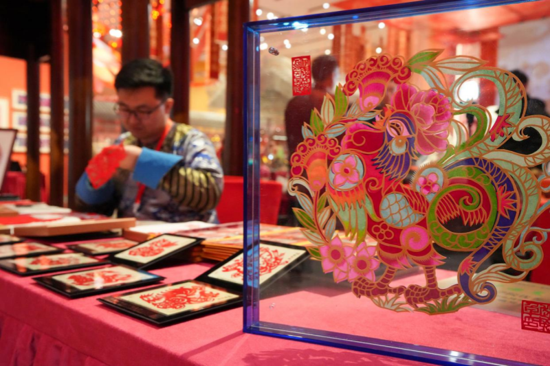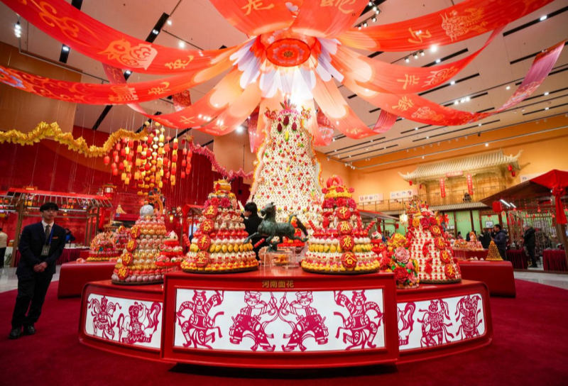 في سوق هدايا التراث الثقافي غير المادي للعام الجديد في قاعة المعرض، يمكن للزوار الاختيار بحرية بين هدايا التراث الثقافي غير المادي لعيد الربيع من جميع أنحاء البلاد. تتيح العديد من الأجنحة أيضًا للزوار تجربة الأجواء الاحتفالية القوية للعام الصيني الجديد من خلال شروحات وعروض توضيحية لمهارات التراث الثقافي غير المادي من قبل الورثة التقليدية، بالإضافة إلى دعوة الزوار للمشاركة في أنشطة عملية.