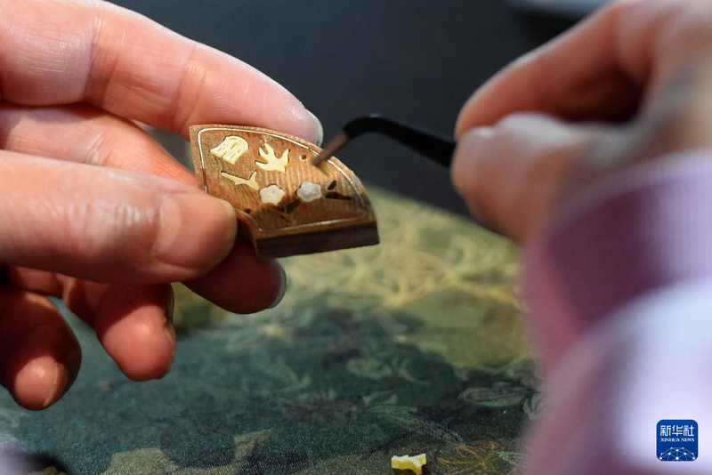 صورة ملتقطة في 9 أبريل: الزوار في تجربة فن التطعيم بالصدف ضمن أنشطة الحرف اليدوية للتراث الثقافي غير المادي في متحف يوان مينغ يوان
